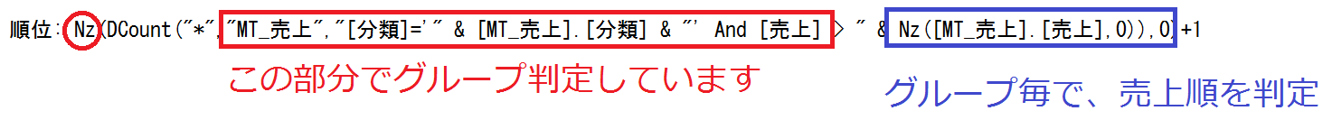順位: Nz(DCount("*","MT_売上","[分類]='" & [MT_売上].[分類] & "' And [売上] > " & Nz([MT_売上].[売上],0)),0)+1