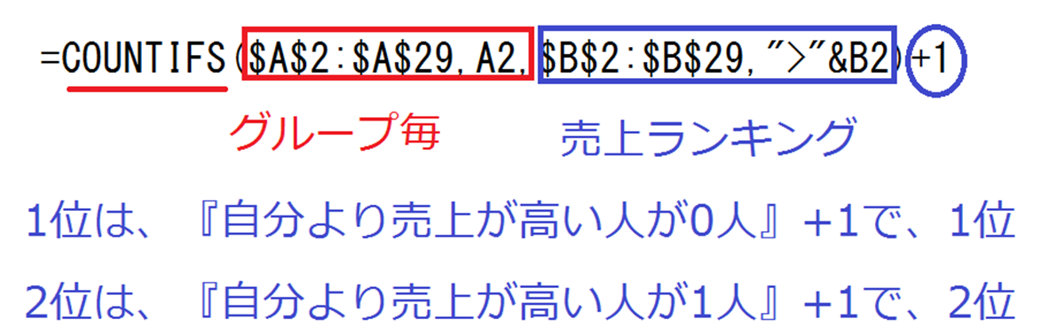 =COUNTIFS($A$2:$A$29,A2,$B$2:$B$29,">"&B2)+1