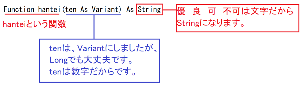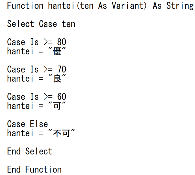 Function hantei(ten As Variant) As String Select Case ten Case Is >= 80 hantei = "優" Case Is >= 70 hantei = "良" Case Is >= 60 hantei = "可" Case Else hantei = "不可" End Select End Function