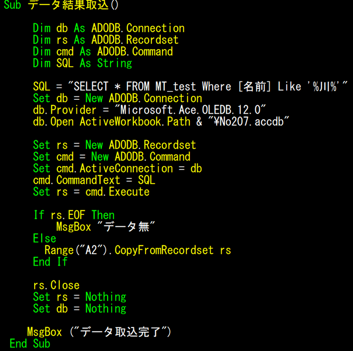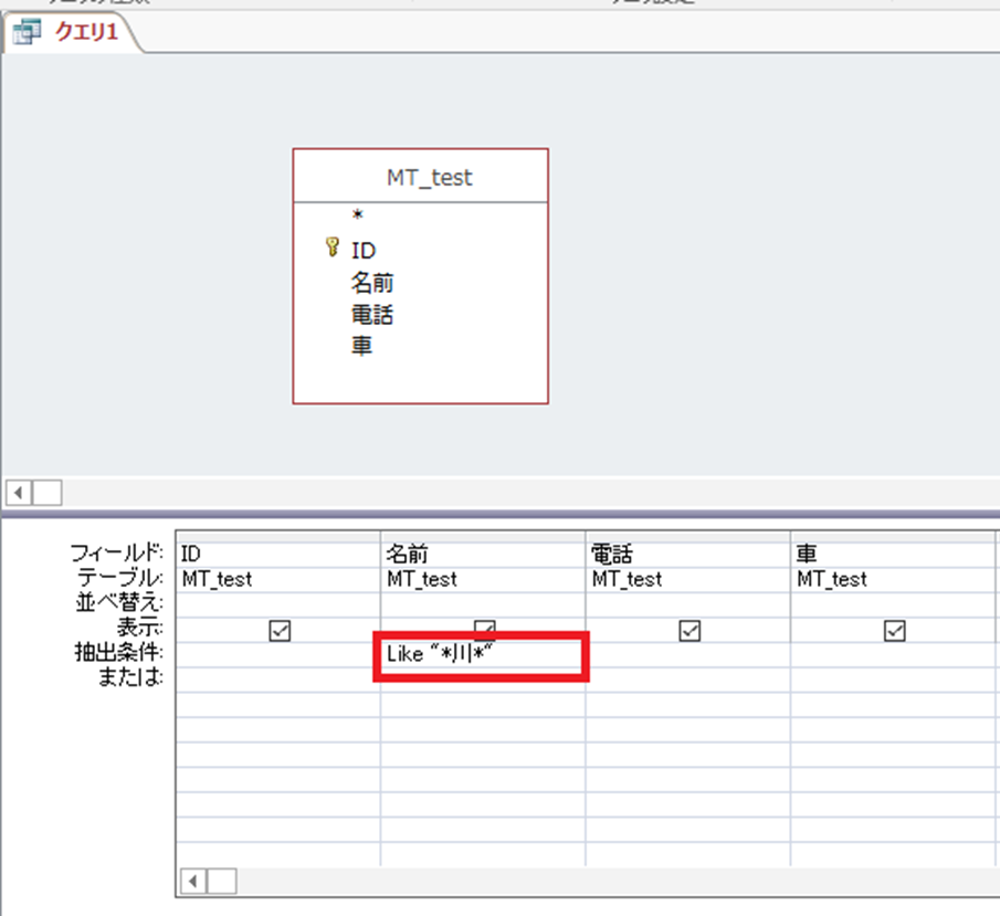 SQL = “SELECT * FROM MT_test Where [名前] Like ‘%川%'”