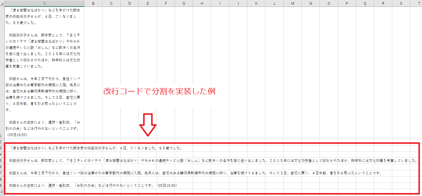 Spirt関数を利用して、改行毎に、セルに書き出します。