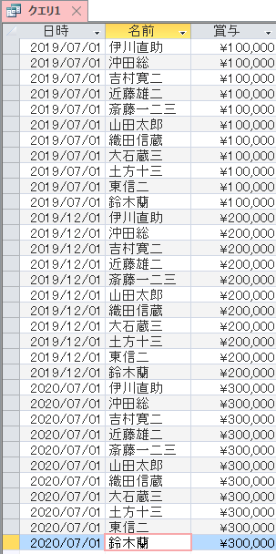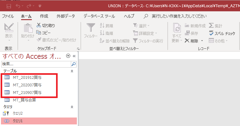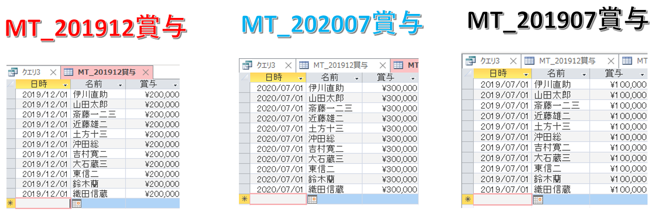 この3回分データを合体させて、MT_賞与合算というテーブルを作成したいと思います。