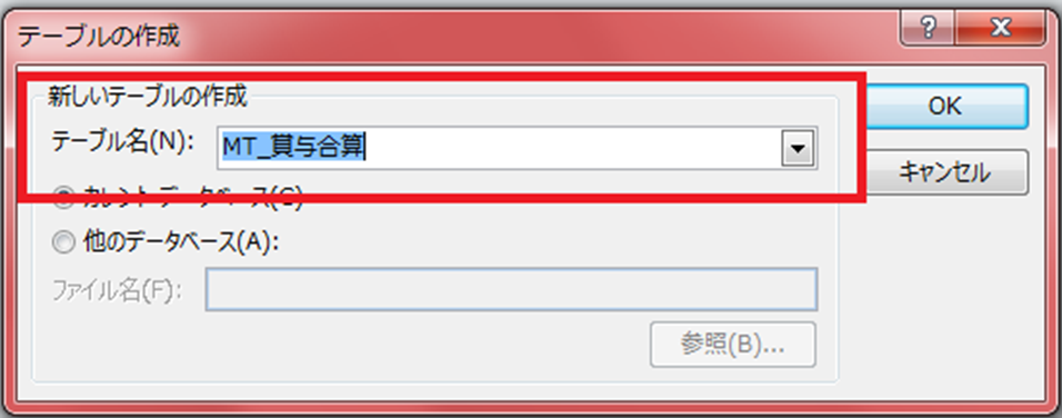 上の図のようになりましたら、テーブル作成の場所をクリック