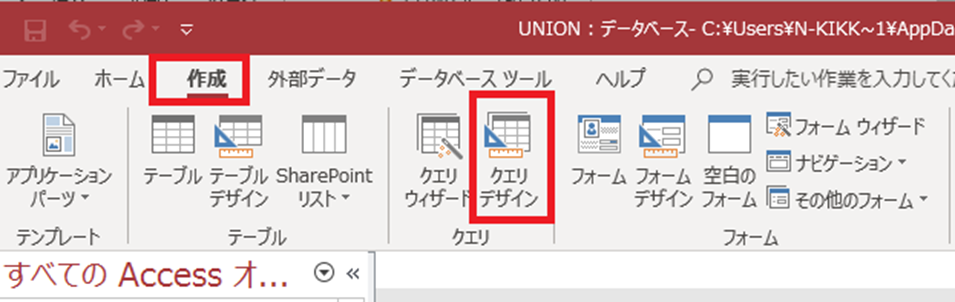 上の図のように、「作成」⇒「クエリデザイン」を選択します。
