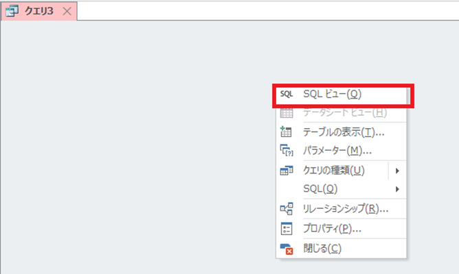 右クリックすると、「SQLビュー(Q)」をクリックします。