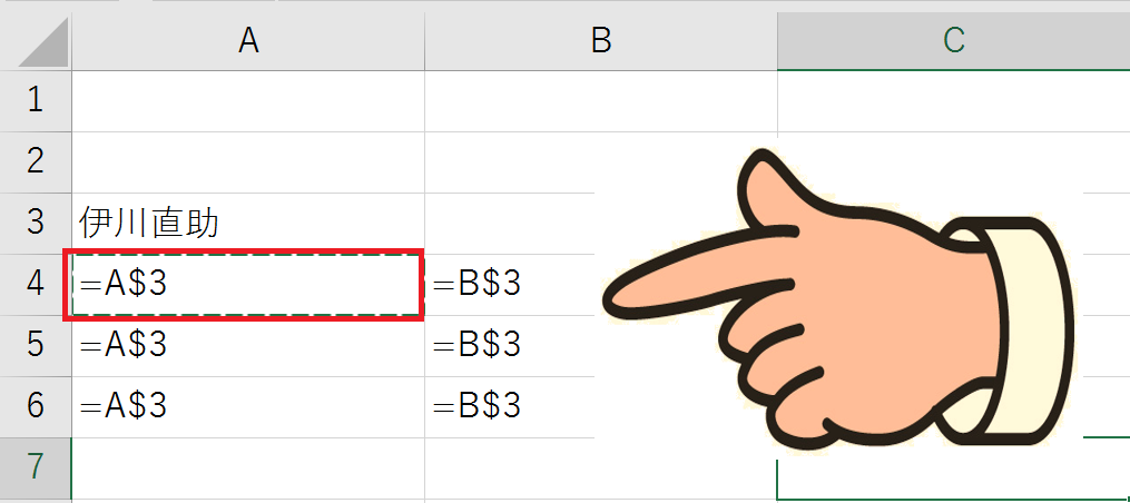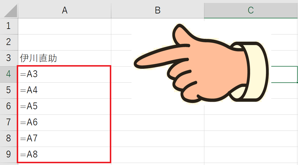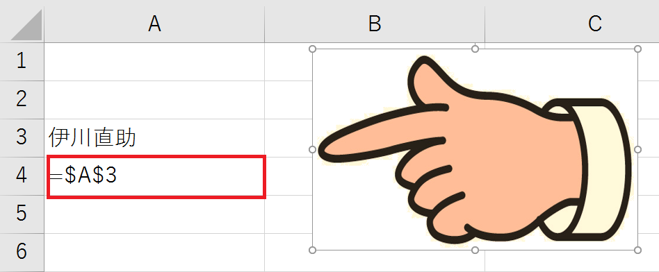 セルA4に、「=A3」と入力すると、セルA4にも「伊川直助」表示されます。