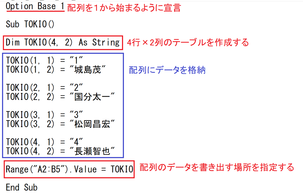 TOKIOの配列のデータを、セルA2から、書き出すように指定しているのです。