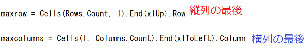 上の図でいうなら、縦列の最後と、横列の最後が交わるセルは、Cells(665,20)となります。