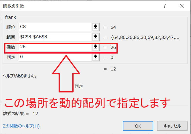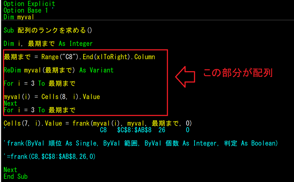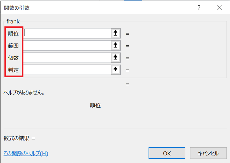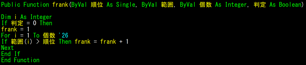 赤枠の中が、frank(ByVal 順位 As Single, ByVal 範囲, ByVal 個数 As Integer, 判定 As Boolean)です。