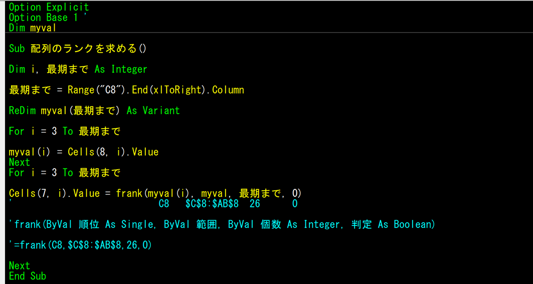 多分、難しいのは、frank(ByVal 順位 As Single, ByVal 範囲, ByVal 個数 As Integer, 判定 As Boolean) の部分だと思います。