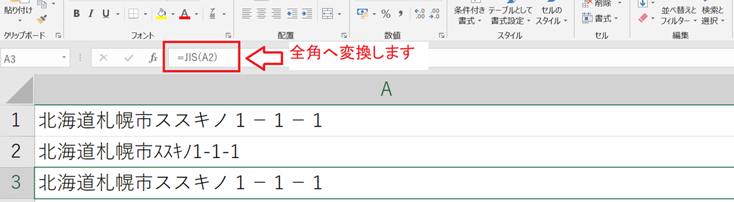 ASC関数/JIS関数 作成手順その3 JIS関数を使って全角へ変換